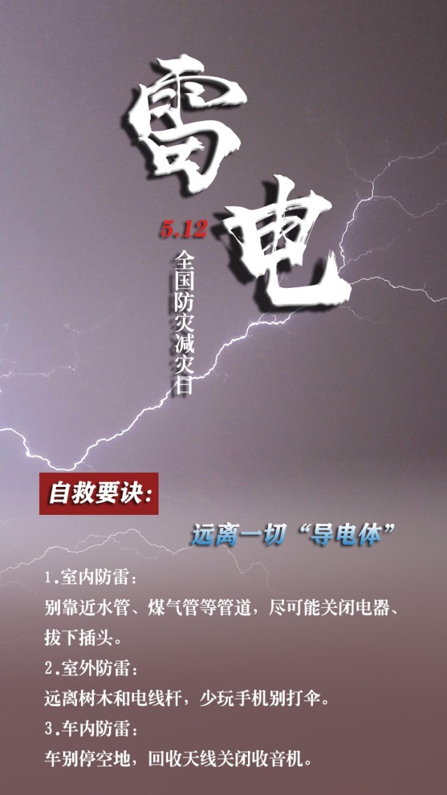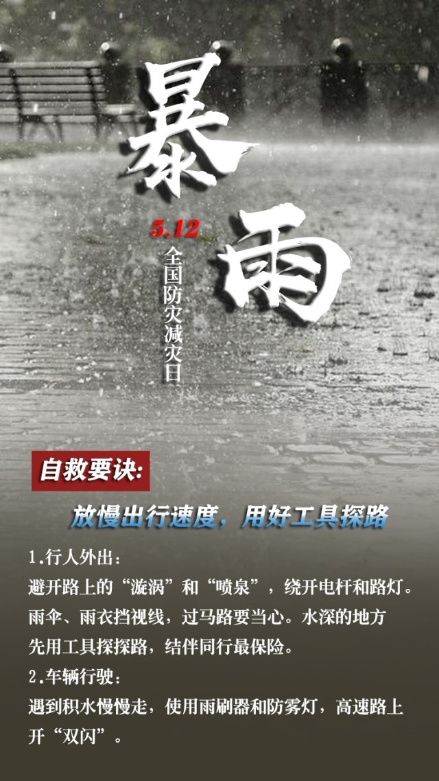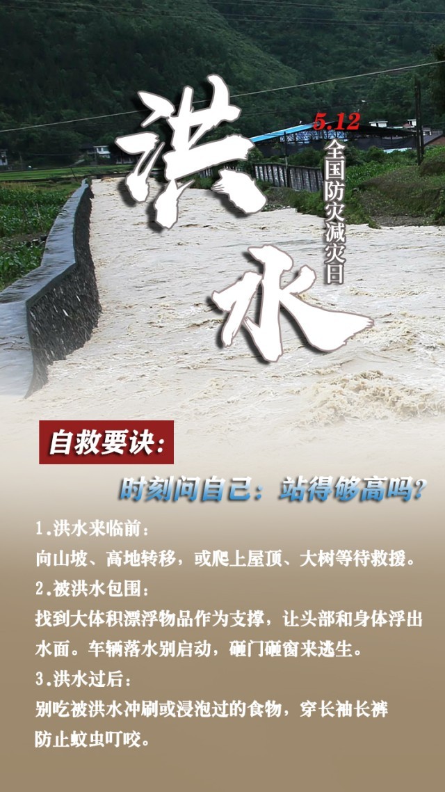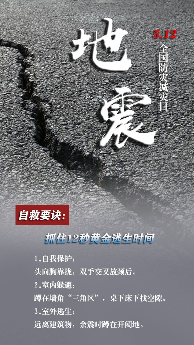 今天是第15個(gè)全國防災(zāi)減災(zāi)日。自然災(zāi)害隨時(shí)可能發(fā)生,及時(shí)自救才更有生存希望。地震來時(shí),如何抓住12秒黃金逃生時(shí)間?發(fā)生火災(zāi)時(shí),如何躲避火場(chǎng)濃煙?暴雨天如何安全出行?沙塵天氣如何做好防護(hù)……這份實(shí)用避險(xiǎn)口訣簡單好記,請(qǐng)速速收藏。