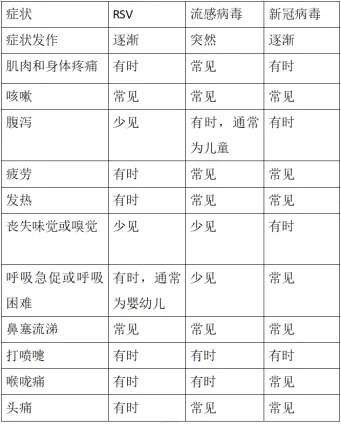 針對(duì)年初到現(xiàn)在流行的新冠病毒、甲型流感病毒和呼吸道合胞病毒,唐蘭芳解釋說(shuō),這三種病毒都是通過(guò)呼吸道傳播、且傳染性強(qiáng)的病毒,均會(huì)引起發(fā)熱、咳嗽及鼻塞流涕等癥狀,因此有時(shí)很難區(qū)分感染了哪種病毒,雖然這些病毒有不少相似的癥狀,但也有一些區(qū)別,如流感病毒感染潛伏期短,通常是突然發(fā)熱,高熱為主,而另外兩種則是逐漸發(fā)病,且呼吸道合胞病毒感染的患兒中腹瀉較為少見(jiàn),可以參考表格內(nèi)容,明確診斷的話(huà)建議行相關(guān)核酸或抗原檢測(cè)。