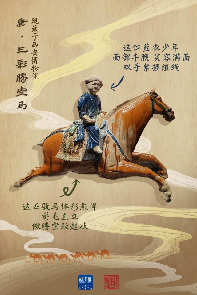1000多年前,一位來自西域的“藍(lán)衣少年”,穿過茫茫戈壁、廣袤沙漠,抵達(dá)長安。這位“藍(lán)衣少年”,是西安博物院“明星”藏品——唐代三彩騰空馬之上的騎手。“他”,也見證了這場跨越千年的文明交融。