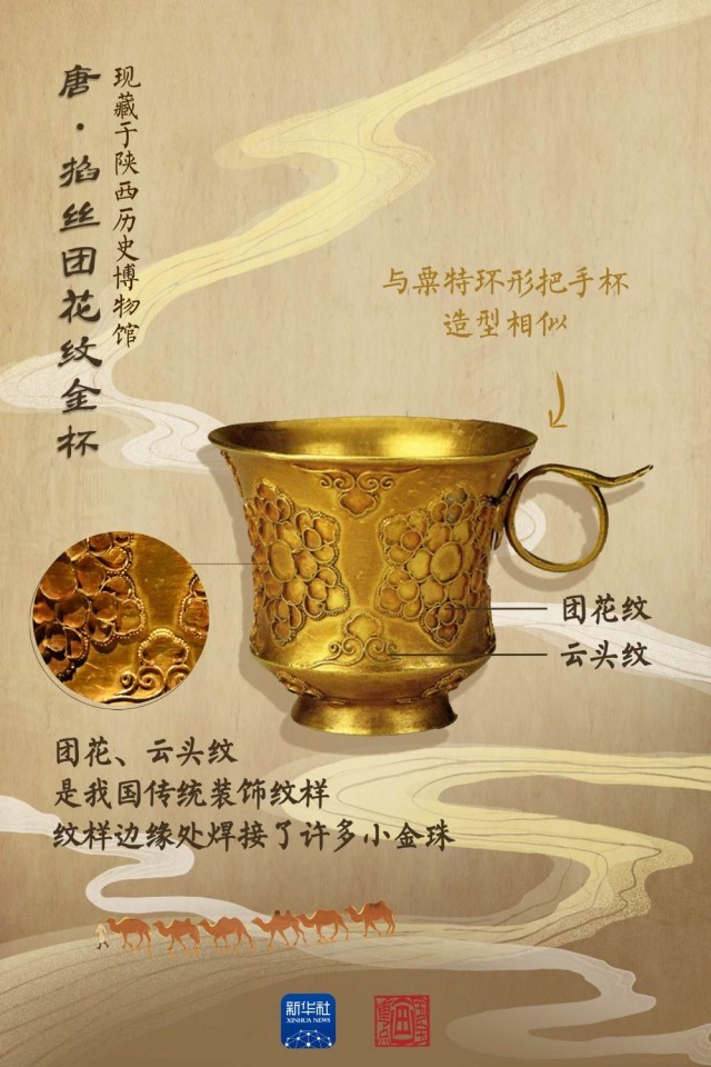 唐代部分帶把杯直接來自中亞粟特,還有部分屬于唐人仿制粟特風(fēng)格的作品。在打磨光滑的杯身上,焊接了四朵黃金質(zhì)地的細(xì)絲編成的團(tuán)花,即團(tuán)花紋;每朵團(tuán)花紋的間隙,還用同樣的制作方式焊接了像云朵一樣的紋飾,即云頭紋。團(tuán)花紋與云頭紋是我國傳統(tǒng)的吉祥圖案,此金杯也是東西方文明通過絲綢之路進(jìn)行交流互鑒的珍貴物證。