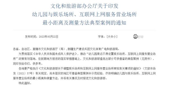 為貫徹落實(shí)《中華人民共和國未成年人保護(hù)法》,推動(dòng)“幼兒園周邊不得設(shè)置娛樂場所、互聯(lián)網(wǎng)上網(wǎng)服務(wù)營業(yè)場所”政策有效落地,在前期地方報(bào)送的落實(shí)舉措基礎(chǔ)上,文化和旅游部遴選出部分可供借鑒的典型案例(見附件),現(xiàn)印發(fā)給你們,供參考。