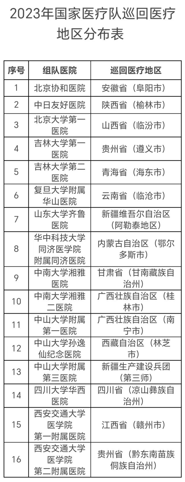 國家醫(yī)療隊的組隊醫(yī)院包括北京協(xié)和醫(yī)院、中日友好醫(yī)院等16家,分赴安徽、陜西等地,派出時間為6—10月。每支國家醫(yī)療隊不少于5人,以副高及以上職稱的醫(yī)務(wù)人員為主,重點開展巡回醫(yī)療、技術(shù)和管理指導(dǎo)、人員培訓(xùn)、加強遠程醫(yī)療協(xié)作網(wǎng)建設(shè)等工作。工作時間不少于3周,其中在縣域開展工作的時間不少于兩周。