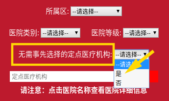 進入頁面后,點擊“無需事先選擇的定點醫(yī)療機構”選項,選擇“是”。