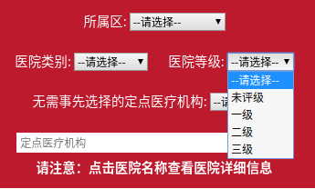 同時可選擇所屬區(qū)、醫(yī)院類別(定點中醫(yī)醫(yī)院、定點專科醫(yī)院、對外綜合等醫(yī)院等)、醫(yī)院等級,或輸入定點醫(yī)院名稱進行詳細查詢。