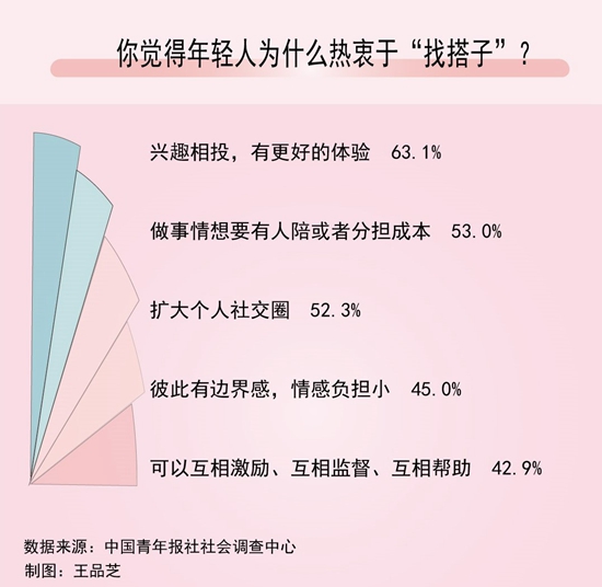 調(diào)查中,52.3%的青年覺得找“搭子”能擴(kuò)大個人社交圈,45.0%的青年覺得彼此有邊界感,情感負(fù)擔(dān)小,42.9%的青年覺得可以互相激勵、互相監(jiān)督、互相幫助。