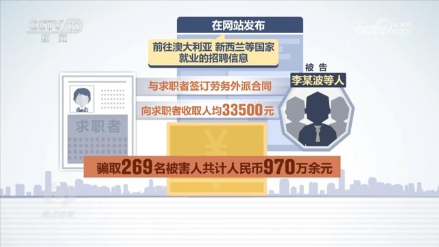2023年5月,北京市房山區(qū)法院也判決了一起出國勞務詐騙案,被告李某波因詐騙罪一審判決13年6個月有期徒刑。判決書顯示:被告李某波等人冒用北京一家勞務派遣有限公司名義開展業(yè)務,在網站發(fā)布前往澳大利亞、新西蘭等國家就業(yè)的招聘信息,與求職者簽訂勞務外派合同,向求職者收取人均33500元的費用,最終騙取269名被害人共計人民幣970萬余元。檢察官還總結了這類詐騙案的幾個特點。