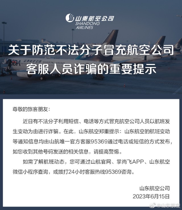 山東航空發(fā)布提示:近日有不法分子冒充航司人員以航班發(fā)生變動(dòng)為由詐騙