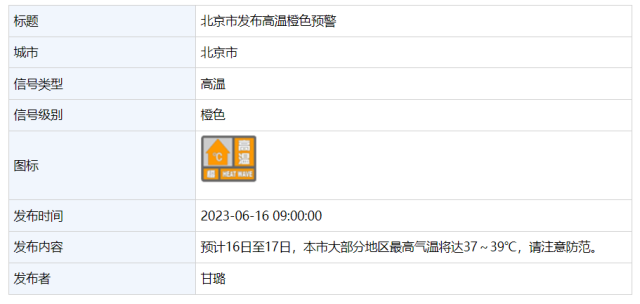 北京市氣象臺(tái)今天(16日)9時(shí)升級(jí)發(fā)布高溫橙色預(yù)警信號(hào):預(yù)計(jì)16日至17日,北京市大部分地區(qū)最高氣溫將達(dá)37~39℃,請(qǐng)注意防范。