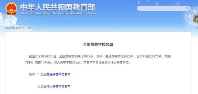 央視網(wǎng)消息:據(jù)教育部,截至2023年6月15日,全國高等學(xué)校共計3072所,其中:普通高等學(xué)校2820所,含本科院校1275所、高職(??疲┰盒?545所;成人高等學(xué)校252所。本名單未包含港澳臺地區(qū)高等學(xué)校。