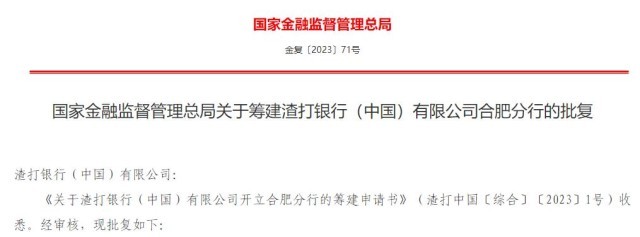 央視網(wǎng)消息:近日,國家金融監(jiān)督管理總局發(fā)布《關(guān)于籌建渣打銀行(中國)有限公司合肥分行的批復(fù)》。主要內(nèi)容如下: