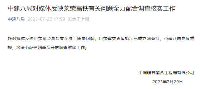 央視網(wǎng)消息:據(jù)“中建八局”公眾號(hào)消息,中國建筑第八工程局有限公司表示,針對(duì)媒體反映山東萊榮高鐵有關(guān)施工質(zhì)量問題,山東省交通運(yùn)輸廳已成立調(diào)查組。中建八局高度重視,將全力配合調(diào)查組開展調(diào)查核實(shí)工作。