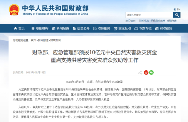 為堅決貫徹落實習(xí)近平總書記重要指示和中央政治局常委會會議精神,按照黨中央、國務(wù)院決策部署,8月19日,財政部會同應(yīng)急管理部再次預(yù)撥10億元中央自然災(zāi)害救災(zāi)資金,重點支持京津冀及黑龍江、吉林等受災(zāi)嚴(yán)重地區(qū)做好受災(zāi)群眾救助等工作,保障受災(zāi)群眾得到妥善安置,及早恢復(fù)災(zāi)區(qū)正常生產(chǎn)生活秩序,入冬前能夠回家或搬入新居。