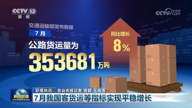 353681萬噸。交通運輸部發(fā)布數(shù)據(jù),7月,公路貨運量為353681萬噸,同比增長8%;水路貨運量為78964萬噸,同比增長6.9%。客運方面,7月公路客運量為40798萬人,同比增長19.3%;水路客運量為3034萬人,同比增長78.3%。
