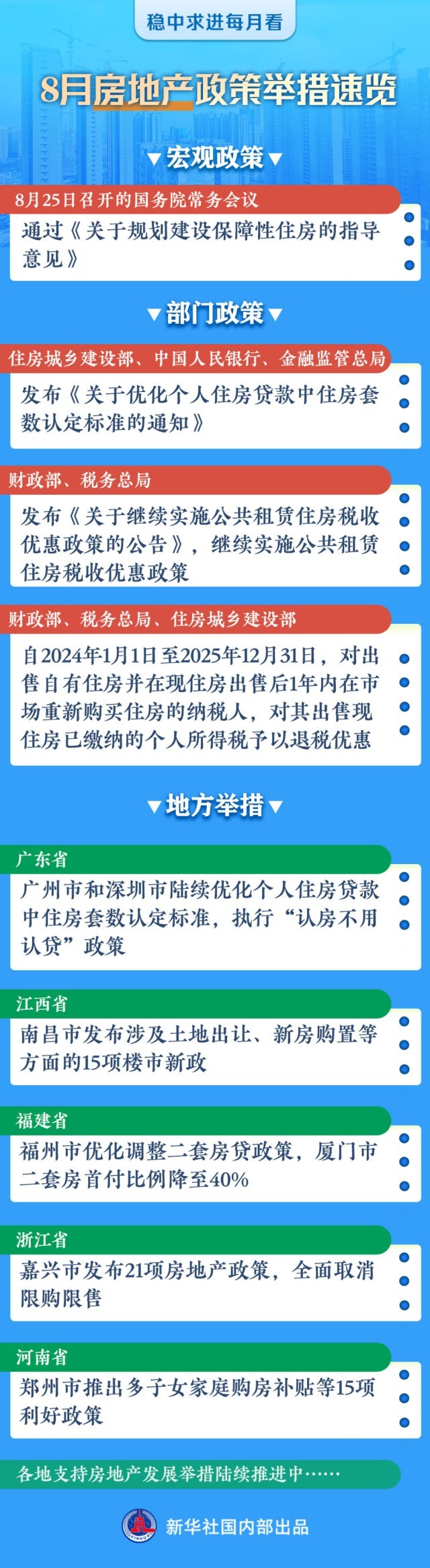 8月以來,各地購(gòu)房者頻頻收到利好消息:江西省南昌市發(fā)布涉及土地出讓、新房購(gòu)置等方面的15項(xiàng)樓市新政;廈門市二套房首付比例降至40%;嘉興市全面取消限購(gòu)限售;鄭州市推出多子女家庭購(gòu)房補(bǔ)貼等15項(xiàng)利好政策……