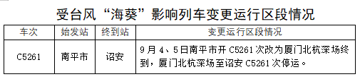 據(jù)中央氣象臺消息,今年第11號臺風“??睂⒂?日凌晨到上午在福建漳浦至廣東惠來一帶沿海登陸,福建東部部分地區(qū)可能有大到暴雨,福建東南部部分地區(qū)有大暴雨,局地特大暴雨。為防范臺風影響,保障運輸安全,中國鐵路南昌局集團有限公司調(diào)整部分旅客列車運行方案,停運途經(jīng)杭深線管內(nèi)漳州(不含)至詔安區(qū)段旅客列車。