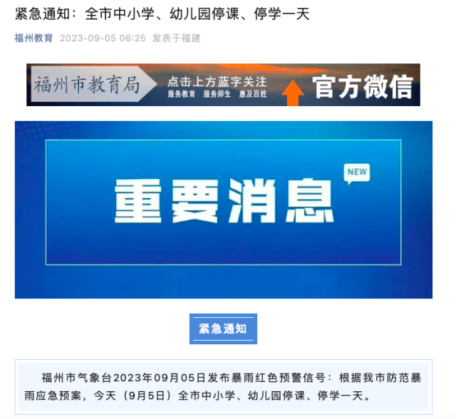 中國青年報客戶端福州9月5日電(中青報·中青網(wǎng)記者 田宏煒)今天早上6時,福州市教育局緊急通知,根據(jù)福州市防范暴雨應(yīng)急預(yù)案,全市中小學(xué)、幼兒園停課、停學(xué)一天。