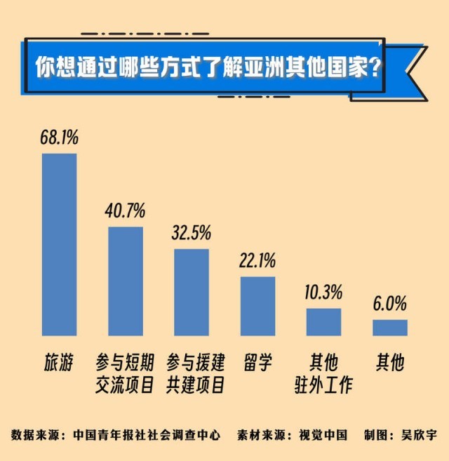 你會(huì)通過什么方式了解亞洲?68.1%的受訪者選擇了旅游,40.7%的受訪者選擇參與短期交流項(xiàng)目,32.5%的受訪者選擇參與援建共建項(xiàng)目,其他還有留學(xué)(22.1%)、駐外工作(10.3%)。