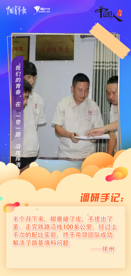 一到任,徐州就面臨難題:項目部標段地層以火山巖等為主,沿線找不到符合標準的常規(guī)填料。如何改良“火山灰”?他帶領(lǐng)12名工作室成員,帶上試驗儀器,頭頂烈日,每天徒步十幾公里,對沿線土源進行取樣、分析。半個月下來,腳磨破了皮,手搓出了繭。走完鐵路沿線100多公里,經(jīng)過上千次的配比實驗,徐州帶領(lǐng)團隊成功解決了路基填料問題。