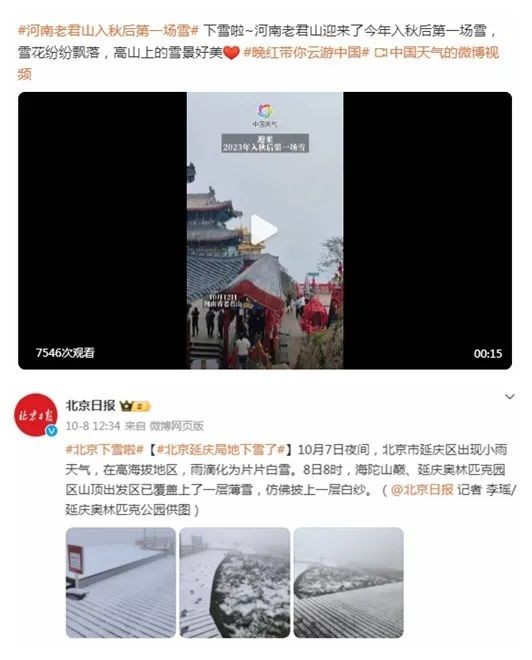 而在此之前,河南老君山就已經(jīng)迎來了入秋以來的第一場(chǎng)雪,甚至在北京延慶的高海拔山區(qū)也迎來了降雪。