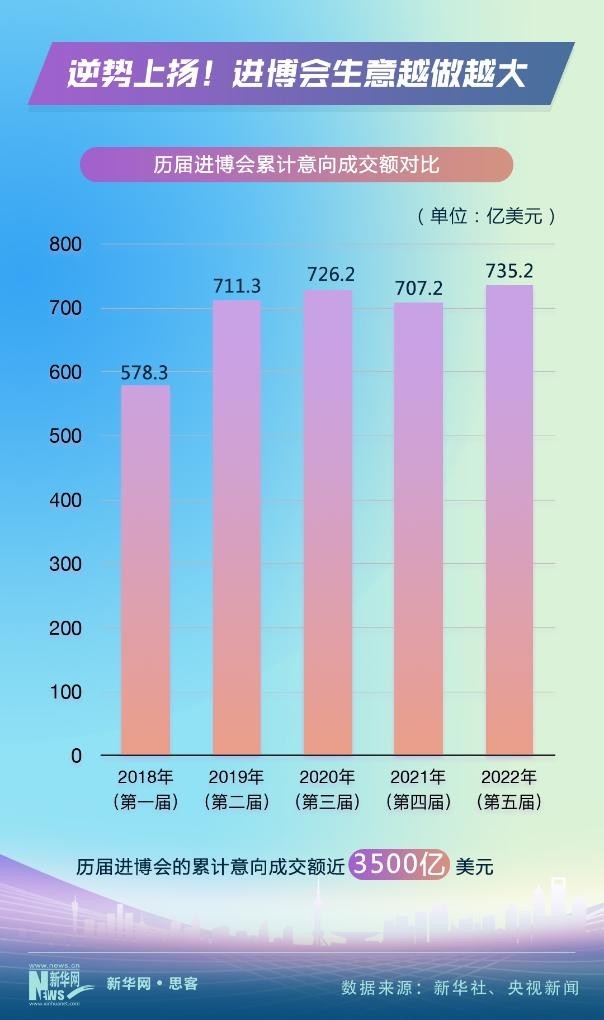 2018年11月,首屆進博會在上?!俺踉囂渎暋?。之后,進博會不顧風雨和險阻,年年如約而至、越辦越好。數據顯示,進博會的累計意向成交額從2018年的578.3億美元,上升到2022年的735.2億美元。前五屆進博會的累計意向成交額近3500億美元。進博會生意越做越大。