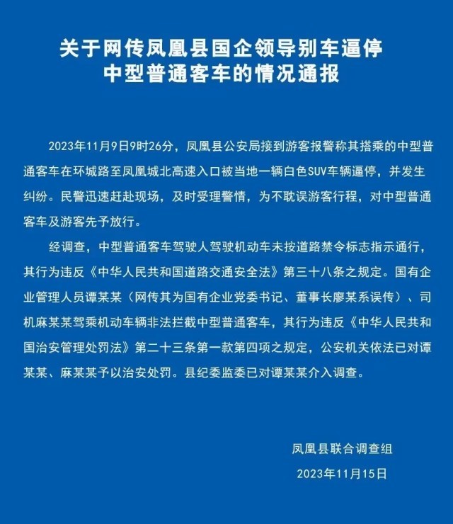 央視網消息:據鳳凰融媒微信公眾號消息,11月15日,鳳凰縣聯(lián)合調查組發(fā)布情況通報,經調查,中型普通客車駕駛人駕駛機動車未按道路禁令標志指示通行,其行為違反相關規(guī)定。國有企業(yè)管理人員譚某某 (網傳其為國有企業(yè)黨委書記、董事長廖某系誤傳)、司機麻某某駕乘機動車輛非法攔截中型普通客車,其行為違反相關規(guī)定,公安機關依法已對譚某某、麻某某予以治安處罰??h紀委監(jiān)委已對譚某某介入調查。