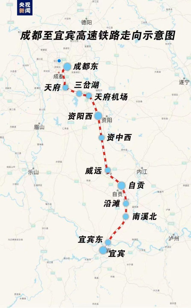 成都至宜賓高速鐵路由新建成都東至宜賓東高速鐵路(以下簡(jiǎn)稱“成宜高鐵”)和新建重慶至昆明高速鐵路宜賓東至宜賓(以下簡(jiǎn)稱“渝昆高鐵宜賓段”)組成。線路北起成宜高鐵成都東站,止于渝昆高鐵宜賓站。成都至宜賓高速鐵路為雙線高速鐵路,全線共設(shè)成都東、天府、三岔湖、天府機(jī)場(chǎng)、資陽(yáng)西、資中西、威遠(yuǎn)、自貢、沿灘、南溪北、宜賓東、宜賓等12個(gè)車站,其中成都東和自貢站為既有站,天府站為緩開(kāi)站。
