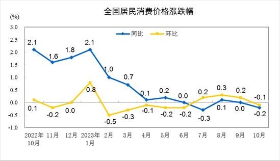 國家統(tǒng)計局?jǐn)?shù)據(jù)顯示,2023年10月,全國CPI環(huán)比下降0.1%,同比下降0.2%,同比時隔兩個月后再度出現(xiàn)負(fù)增長。
