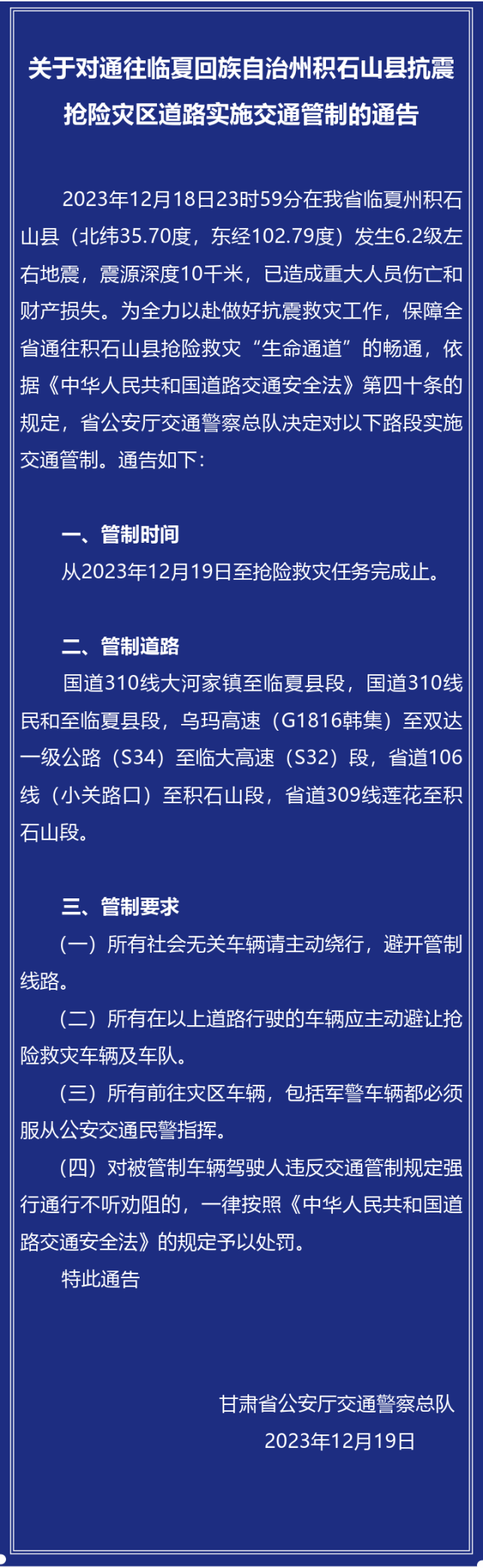 2023年12月18日23時59分在甘肅省臨夏州積石山縣發(fā)生6.2級左右地震,已造成重大人員傷亡和財產(chǎn)損失。為全力以赴做好抗震救災(zāi)工作,保障甘肅全省通往積石山縣搶險救災(zāi)“生命通道”的暢通,甘肅省公安廳交通警察總隊對抗震搶險災(zāi)區(qū)道路實施交通管制,至搶險救災(zāi)任務(wù)完成止,詳情如下: