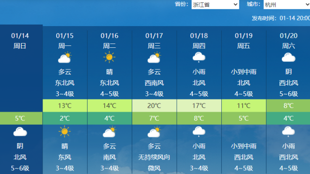 像是杭州,今天最高氣溫22.6℃,剛刷新當(dāng)?shù)?月中旬最高氣溫紀(jì)錄,明天氣溫陡降,雖預(yù)報(bào)最高氣溫14℃,但今晚開(kāi)始?xì)鉁氐钩?,?shí)際明天下午最高氣溫將不足10℃,17日氣溫再度升至20℃,大幅偏高,20日又降至8℃。