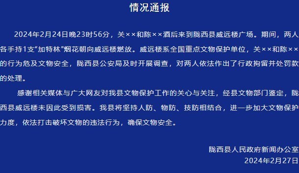 2024年2月24日晚23時56分,關(guān)××和陳××酒后來到隴西縣威遠(yuǎn)樓廣場。期間,兩人各手持1支“加特林”煙花朝向威遠(yuǎn)樓燃放。威遠(yuǎn)樓系全國重點文物保護單位,關(guān)××和陳××的行為危及文物安全,隴西縣公安局及時開展調(diào)查,對兩人依法作出了行政拘留并處罰款的處理。