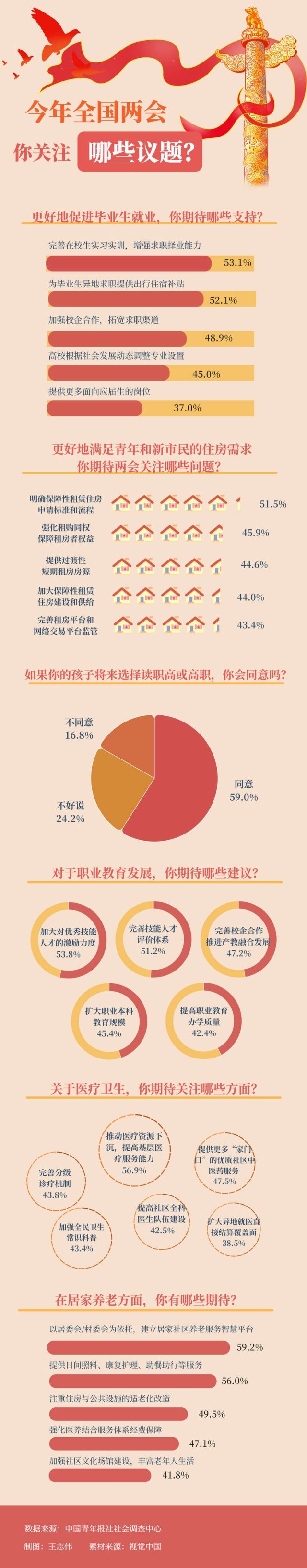 全國兩會時間開啟,哪些議題牽動著大家的心?全國兩會前夕,中青報社調(diào)中心進行的一項調(diào)查顯示,就業(yè)、教育、醫(yī)療、住房等民生議題頗受關(guān)注。今年全國兩會,你關(guān)注哪些議題?