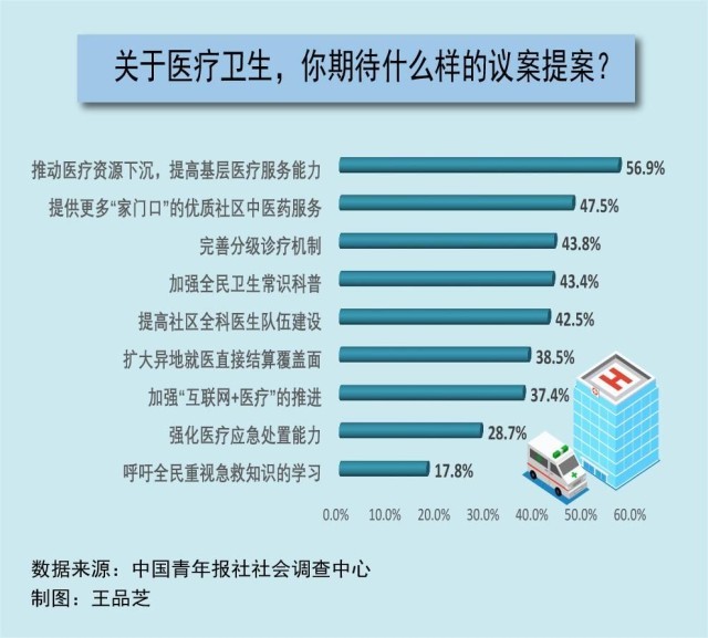 每年全國兩會,醫(yī)療衛(wèi)生都是代表委員們熱議的話題。在全國兩會召開前夕,中國青年報社社會調(diào)查中心聯(lián)合問卷網(wǎng)(wenjuan.com),進行了全國兩會青年期待調(diào)查,共有2002人參與。調(diào)查顯示,在兩會關(guān)于醫(yī)療衛(wèi)生領(lǐng)域的議題中,56.9%的受訪者最期待推動醫(yī)療資源下沉,提高基層醫(yī)療服務能力,47.5%的受訪者期待提供更多“家門口”的優(yōu)質(zhì)社區(qū)中醫(yī)藥服務。