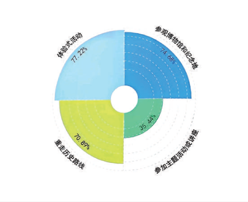 愛國主義教育入耳、入腦,更入心。此次調(diào)研中,79.75%的受訪者參與過紅色旅游,年齡主要集中在18~35歲之間。超過70%的人選擇參觀博物館和紀(jì)念地(74.68%)、重走歷史路線(70.89%)以及體驗式活動(77.22%)三種形式,90.87%的受訪者表示,參與紅色旅游的目的是學(xué)習(xí)歷史文化知識、接受紅色文化洗禮。