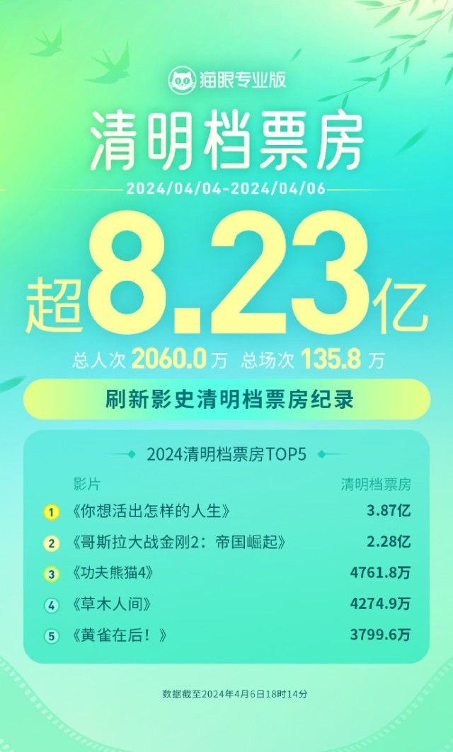 央視網(wǎng)消息:據(jù)貓眼專業(yè)版數(shù)據(jù),截至4月6日18時14分,2024年清明檔(4月4日—4月6日)總票房突破8.23億,超2021年清明檔票房成績,刷新中國影史清明檔票房紀錄。