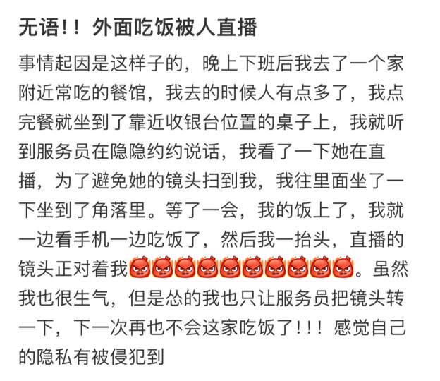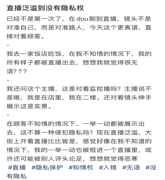 據(jù)媒體報道,近期,陜西西安兩名老人用餐時被商家拍下視頻,之后商家又私自將拍攝內(nèi)容發(fā)到網(wǎng)上,老人親戚無意刷到視頻才發(fā)現(xiàn)。在老人家屬與其多次溝通后,商家刪除了視頻。消費者多在不知情或者未被征詢意見的情況下被動充當(dāng)商家直播或者拍攝短視頻的引流工具,除了自己的言行舉止可能被迫接受他人的凝視和審判外,還有面部信息泄露風(fēng)險。