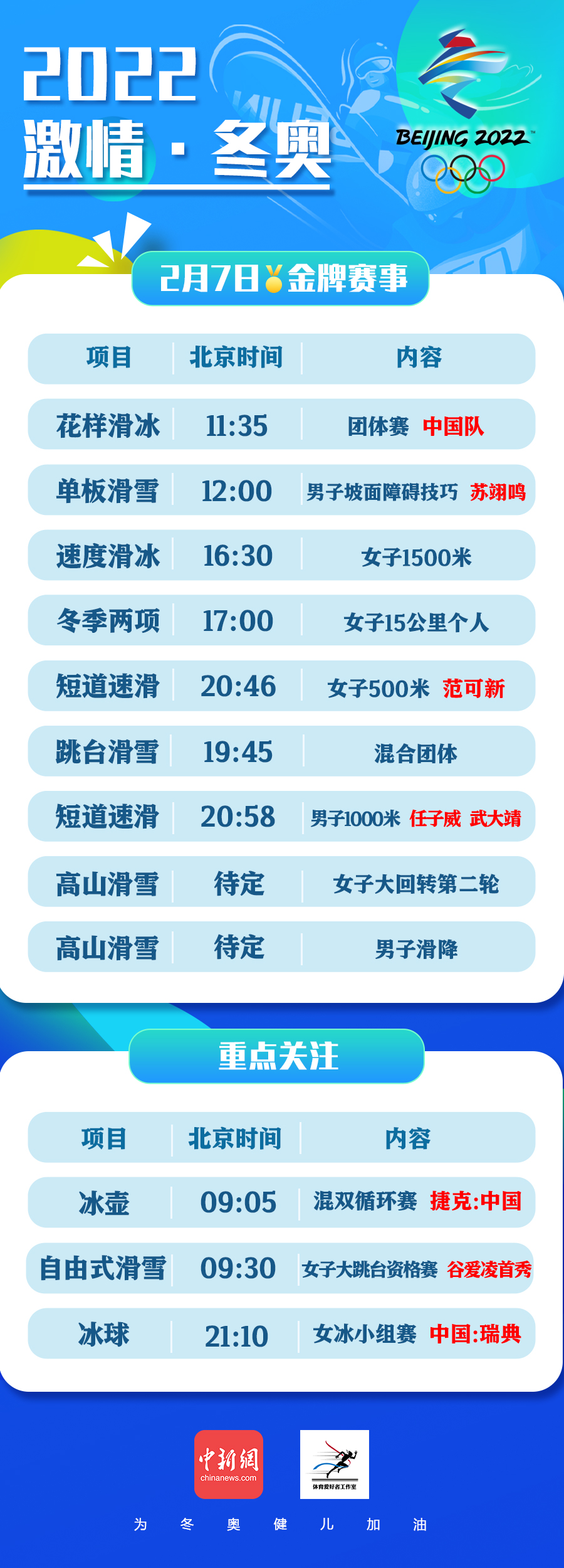 中新網(wǎng)2月7日電 蘇翊鳴爭冠、谷愛凌首秀、中國短道速滑再沖金、速度滑冰“冬奧獎牌王”有望擴大紀(jì)錄……7日的北京冬奧賽場,諸多看點值得期待。