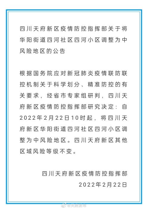 中新網(wǎng)2月22日電 據(jù)“天府發(fā)布”微博消息,四川天府新區(qū)疫情防控指揮部發(fā)布關(guān)于將華陽街道四河社區(qū)四河小區(qū)調(diào)整為中風(fēng)險(xiǎn)地區(qū)的公告:
