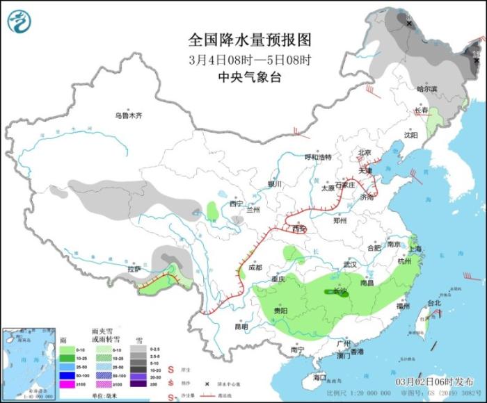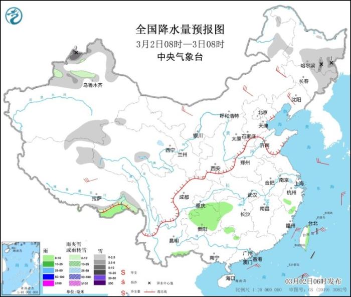 全國(guó)降水量預(yù)報(bào)圖(3月2日08時(shí)-3日08時(shí))