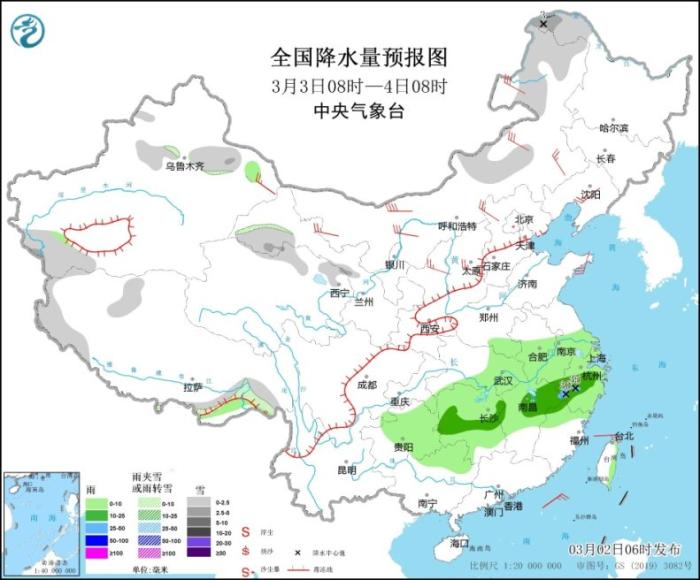 3月3日08時(shí)至4日08時(shí),內(nèi)蒙古東北部、黑龍江西北部、新疆沿天山地區(qū)等地部分地區(qū)有小到中雪(2.5~3毫米)。江淮大部、江漢東部、江南大部、西南地區(qū)東南部、廣西東北部等地部分地區(qū)有小到中雨,其中,江西北部、浙江中部等地部分地區(qū)有大雨(25~35毫米)。內(nèi)蒙古、遼寧、新疆東部、陜西北部、山西中部、河北北部、山東半島等地部分地區(qū)有4~6級(jí)風(fēng),其中,內(nèi)蒙古西北部部分地區(qū)有6~7級(jí)風(fēng)。