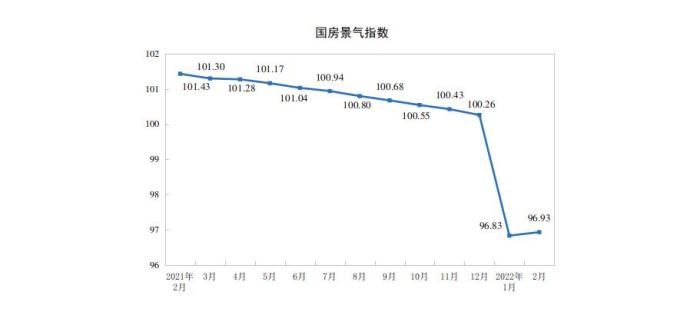 2月份,房地產開發(fā)景氣指數(shù)(簡稱“國房景氣指數(shù)”)為96.93。