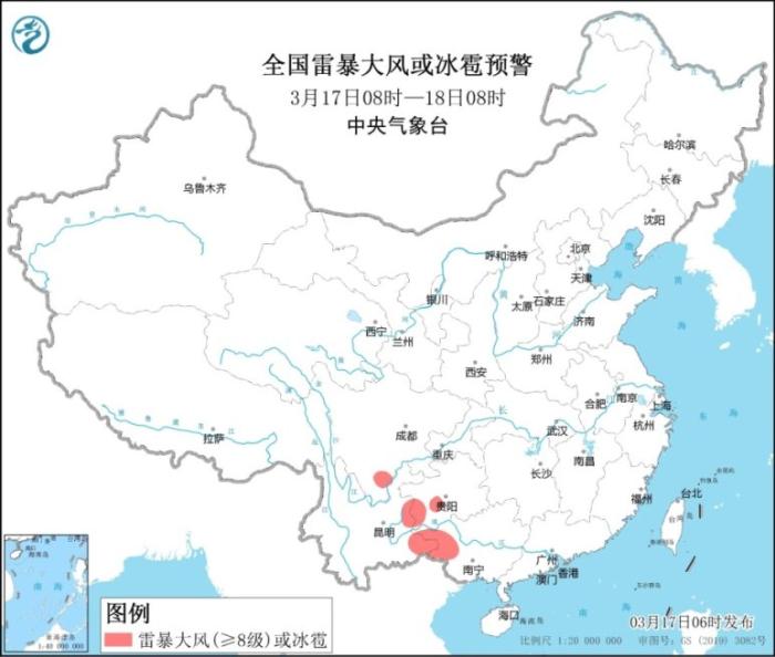 全國雷暴大風或冰雹預警圖(3月17日8時-18日8時)
