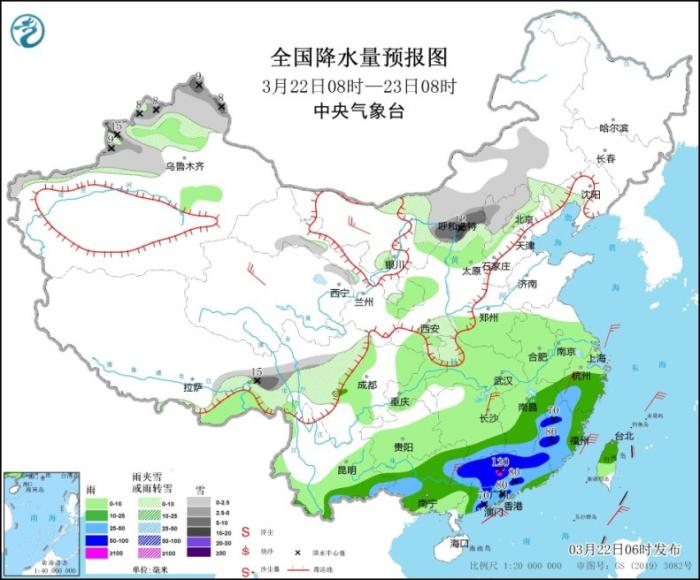 3月22日08時至23日08時,內(nèi)蒙古中東部、新疆北部、西藏東部、甘肅中部、陜西北部和東南部、山西北部、河北西北部、北京西北部、遼寧西部等地部分地區(qū)有小到中雪或雨夾雪,其中,新疆北疆北部和伊犁河谷、西藏東北部、內(nèi)蒙古中部、山西北部等地部分地區(qū)有大到暴雪(10~15毫米)。江南中東部和南部、云南東南部、華南大部、臺灣島等地部分地區(qū)有中到大雨,其中,江西南部、福建西部、廣西東北部、廣東中北部及西部沿海等地局部地區(qū)有暴雨或大暴雨(100~120毫米)。內(nèi)蒙古西北部、青海北部、江南南部、華南北部等地部分地區(qū)有4~5級風(見圖2)。