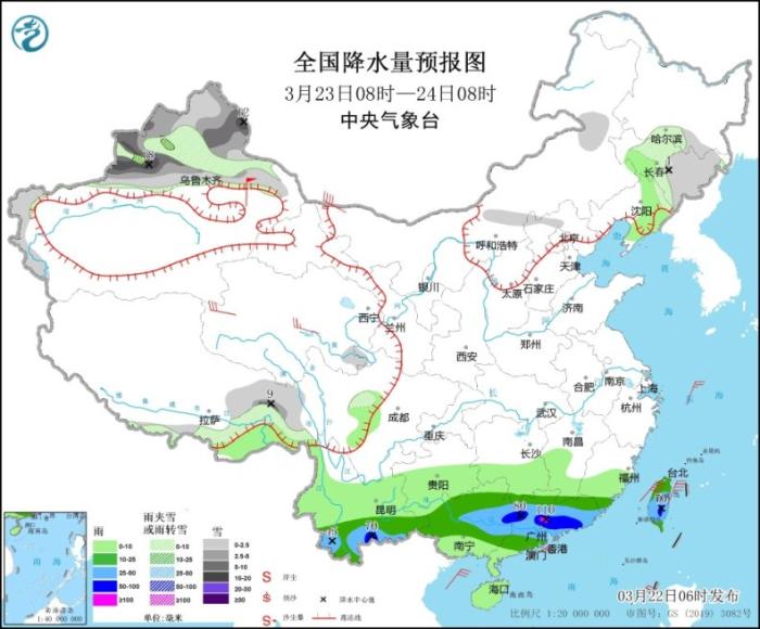 3月23日08時至24日08時,新疆北部和西部山區(qū)、吉林中東部、西藏東北部等地部分地區(qū)有小到中雪或雨夾雪,其中,新疆北疆東部和伊犁河谷部分地區(qū)有大到暴雪(10~18毫米)。云南南部、華南、臺灣島等地部分地區(qū)有中到大雨,其中,云南東南部、廣西東部、廣東中部和東部、臺灣島中南部等地部分地區(qū)有暴雨或大暴雨(100~110毫米)。內(nèi)蒙古西部、青海、新疆東部等地部分地區(qū)有4~6級風,其中,新疆東部部分地區(qū)有7~8級風(見圖3)。