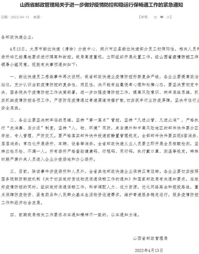 中新財經(jīng)4月15日電 13日,山西省郵政管理局發(fā)布通知緊急部署行業(yè)疫情防控和穩(wěn)運行保通暢工作 ,要求全省從業(yè)人員要立即開展全員核酸檢測,堅持應檢盡檢、不漏一人。除此次涉疫場所外,全省其他郵政快遞企業(yè)均保持正常運轉。