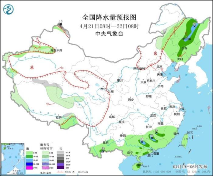 4月21日08時(shí)至22日08時(shí),新疆北疆北部和沿天山地區(qū)、西藏北部和東部、青海西南部、內(nèi)蒙古東部等地的部分地區(qū)有小到中雪或雨夾雪,其中阿勒泰高海拔地區(qū)局地有大雪或暴雪(10~15毫米);黑龍江中部、吉林中部、遼寧北部、江西南部、湖南南部、廣東北部、廣西東部、海南島、云南南部等地的部分地區(qū)中到大雨。內(nèi)蒙古中西部、東北地區(qū)、華北中北部、山東半島、西藏中北部等地的部分地區(qū)有4~6級(jí)風(fēng)(見圖3);黃海北部海域有6~7級(jí)、陣風(fēng)8級(jí)的偏南風(fēng),渤海、渤海海峽、黃海中部和南部海域有5~6級(jí)、陣風(fēng)7級(jí)的偏南到西北風(fēng)。