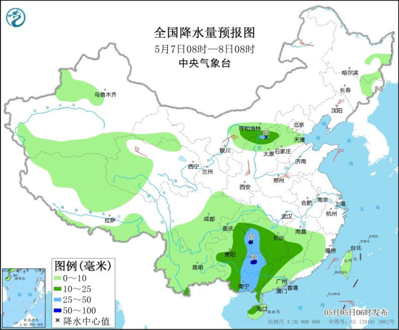 5月7日8時(shí)至8日8時(shí),內(nèi)蒙古河套地區(qū)、陜西北部、山西北部、貴州東部和南部、江南西部、華南西部等地的部分地區(qū)有中到大雨,其中,湖南西部、廣西北部等地局地有暴雨(50~60毫米)。內(nèi)蒙古河套地區(qū)、東北地區(qū)南部、陜西北部等地部分地區(qū)有4~6級(jí)風(fēng)。