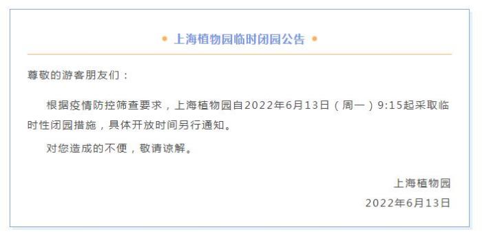 中新財(cái)經(jīng)6月13日電 上海植物園6月13日在微信公眾號(hào)發(fā)布公告稱,根據(jù)疫情防控篩查要求,上海植物園自2022年6月13日(周一)9:15起采取臨時(shí)性閉園措施,具體開放時(shí)間另行通知。(完)