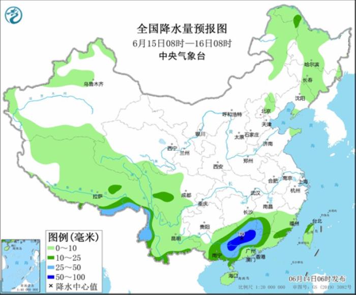 6月15日08時(shí)至16日08時(shí),江南南部、華南中北部、云南西部、西藏東南部等地部分地區(qū)有中到大雨,其中,廣西東部、廣東北部等地部分地區(qū)有暴雨(50~90毫米)。
