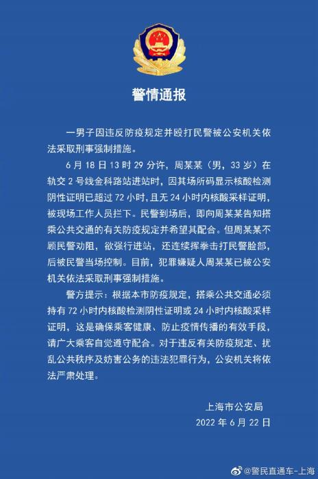 6月18日13時(shí)29分許,周某某(男,33歲)在軌交2號線金科路站進(jìn)站時(shí),因其場所碼顯示核酸檢測陰性證明已超過72小時(shí),且無24小時(shí)內(nèi)核酸采樣證明,被現(xiàn)場工作人員攔下。民警到場后,即向周某某告知搭乘公共交通的有關(guān)防疫規(guī)定并希望其配合。但周某某不顧民警勸阻,欲強(qiáng)行進(jìn)站,還連續(xù)揮拳擊打民警臉部,后被民警當(dāng)場控制。目前,犯罪嫌疑人周某某已被公安機(jī)關(guān)依法采取刑事強(qiáng)制措施。