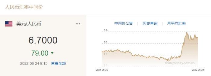 人民幣兌美元中間價(jià)報(bào)6.7000,上調(diào)79個(gè)基點(diǎn)